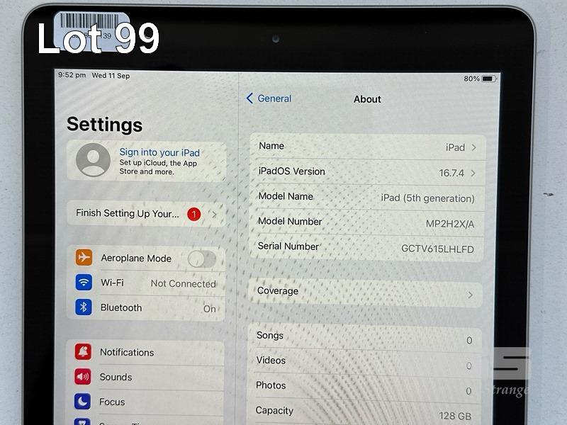 APPLE iPAD 5TH GEN, 128GB, Wi-Fi, SPACE GREY, MODEL MP2H2X/A, A1822 (NO CABLE, NO CHARGER) S/N:GCTV615LHLFD