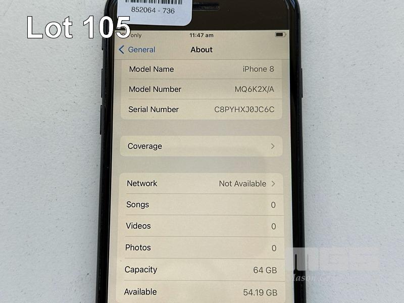 APPLE iPHONE 8, 64GB, SPACE GREY, MODEL MQ6K2X/A, BATTERY HEALTH 87% (NO CABLE, NO CHARGER) S/N:C8PYHXJ0JC6C