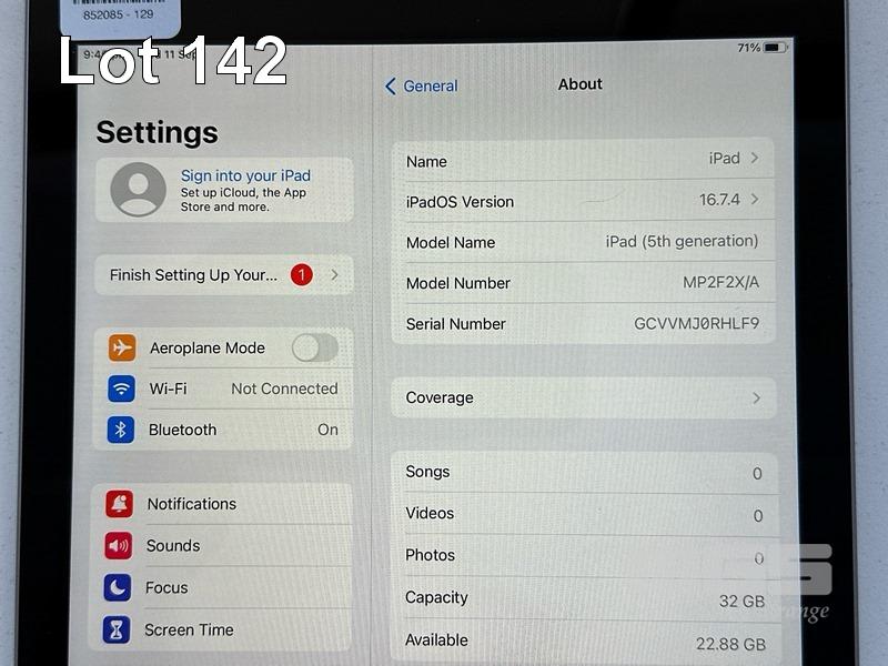 APPLE iPAD 5TH GEN, 32GB, Wi-Fi, SPACE GREY, MODEL MP2F2X/A, A1822 (NO CABLE, NO CHARGER) S/N:GCVVMJ0RHLF9