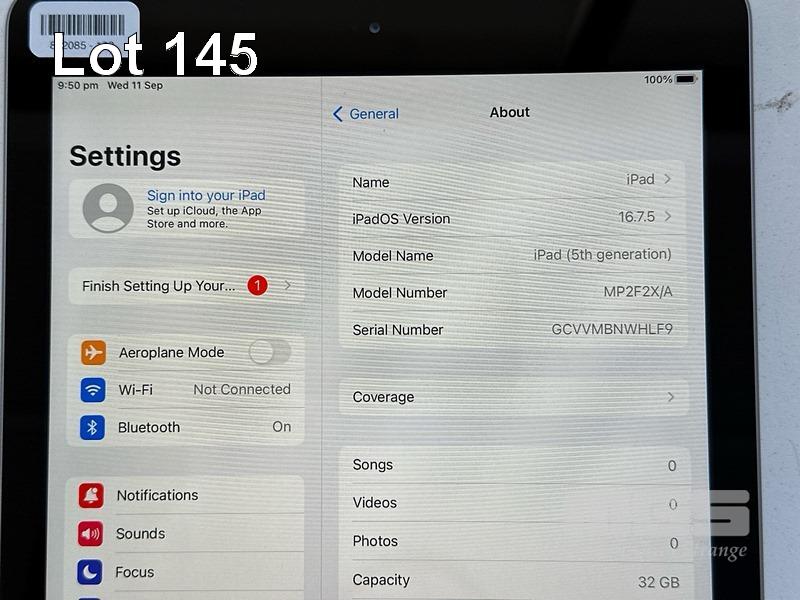 APPLE iPAD 5TH GEN, 32GB, Wi-Fi, SPACE GREY, MODEL MP2F2X/A, A1822 (NO CABLE, NO CHARGER) S/N:GCVVMBNWHLF9