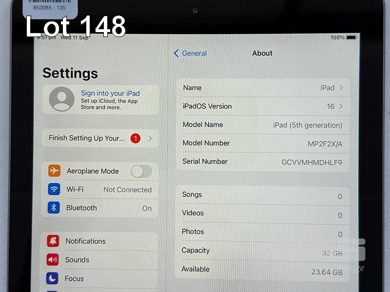 APPLE iPAD 5TH GEN, 32GB, Wi-Fi, SPACE GREY, MODEL MP2F2X/A, A1822 (NO CABLE, NO CHARGER) S/N:GCVVMHMDHLF9