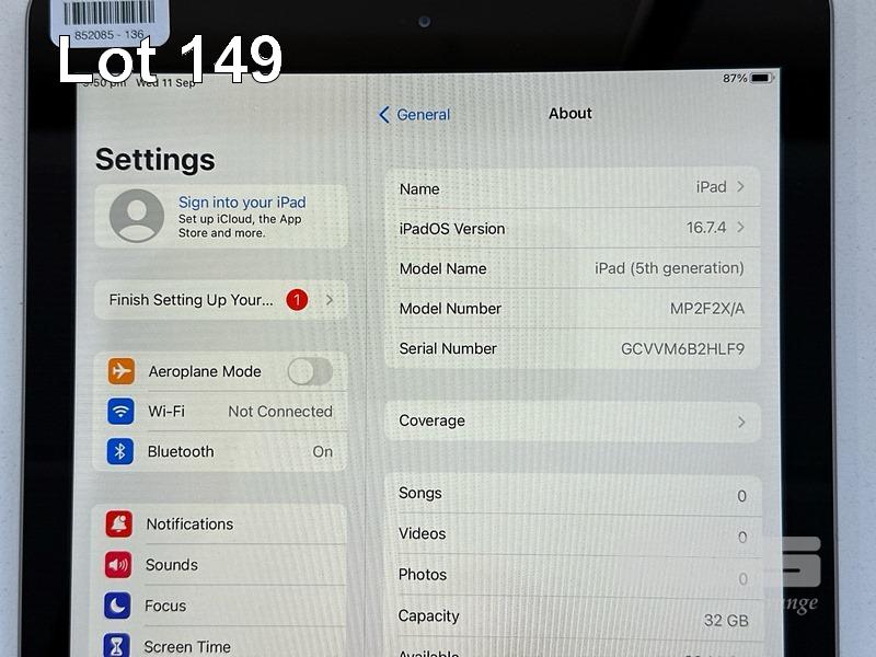 APPLE iPAD 5TH GEN, 32GB, Wi-Fi, SPACE GREY, MODEL MP2F2X/A, A1822 (NO CABLE, NO CHARGER) S/N:GCVVM6B2HLF9