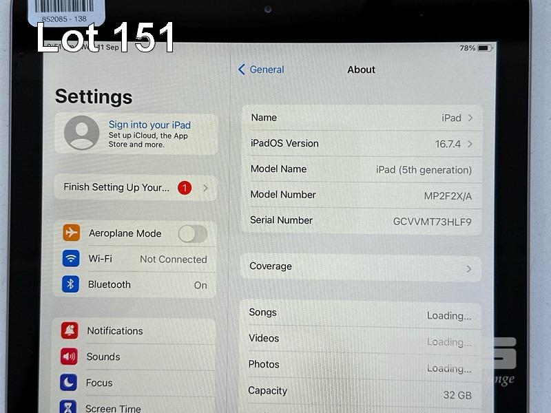APPLE iPAD 5TH GEN, 32GB, Wi-Fi, SPACE GREY, MODEL MP2F2X/A, A1822 (NO CABLE, NO CHARGER) S/N:GCVVMT73HLF9