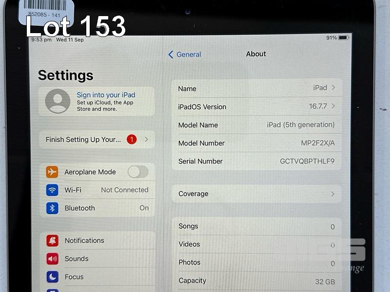 APPLE iPAD 5TH GEN, 32GB, Wi-Fi, SPACE GREY, MODEL MP2F2X/A, A1822 (NO CABLE, NO CHARGER) S/N:GCTVQBPTHLF9