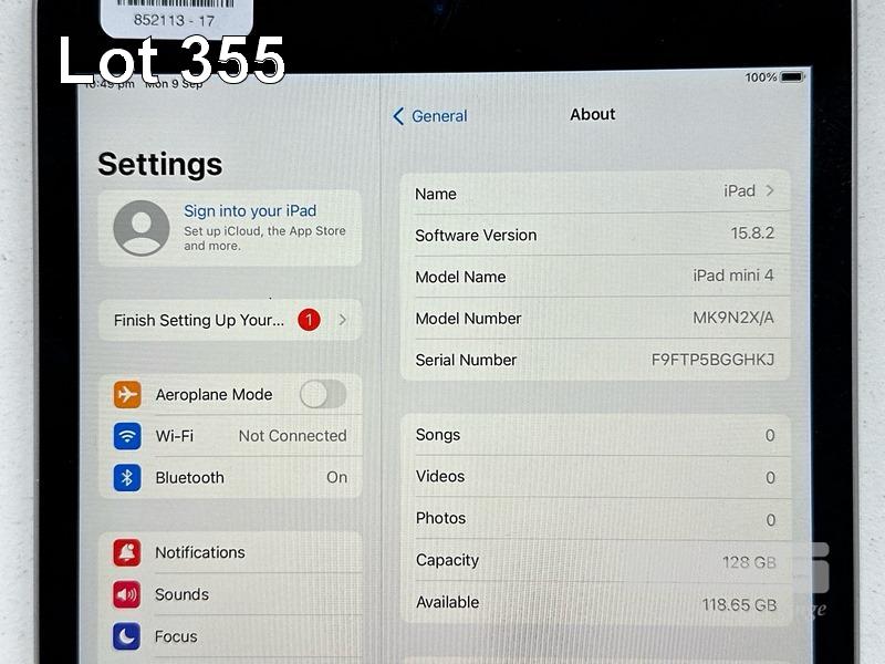 APPLE iPAD MINI 4TH GEN, 128GB, Wi-Fi, SPACE GREY, MODEL MK9N2X/A, A1538 (NO CABLE, NO CHARGER) S/N:F9FTP5BGGHKJ