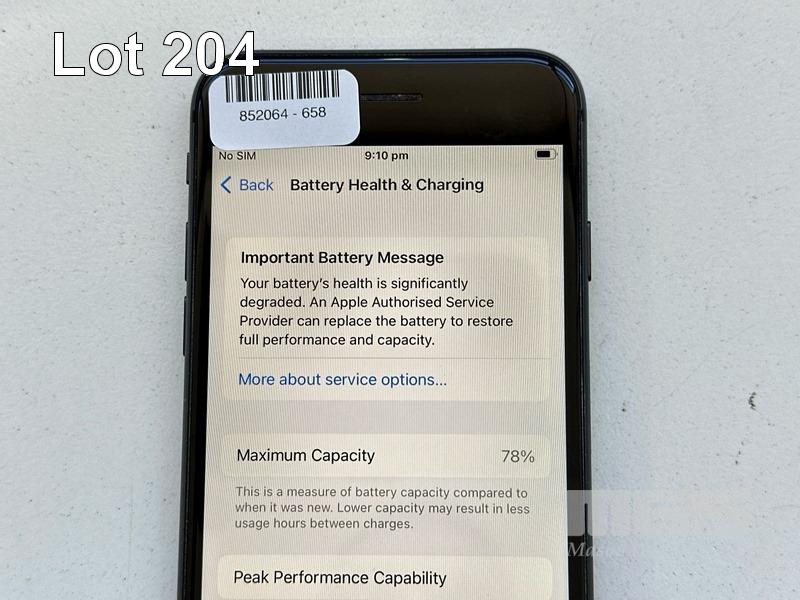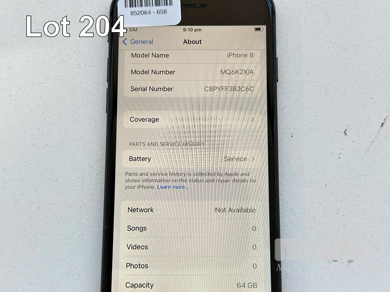 APPLE iPHONE 8, 64GB, SPACE GREY, MODEL MQ6K2X/A, BATTERY HEALTH 78% (NO CABLE, NO CHARGER) (NOTE: BATTERY SERVICE MESSAGE) S/N:C8PYFF3BJC6C