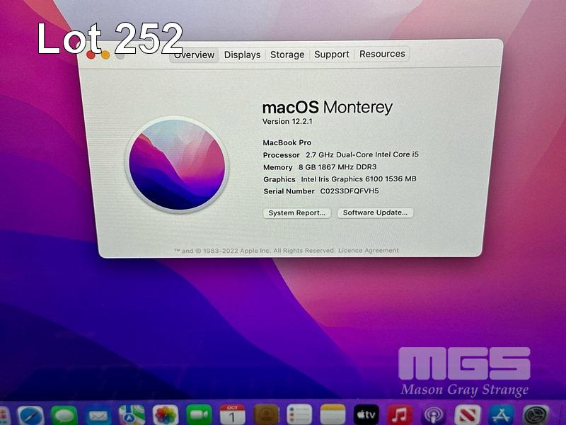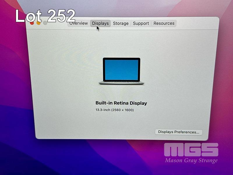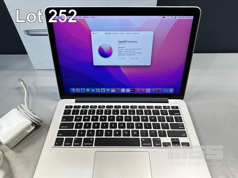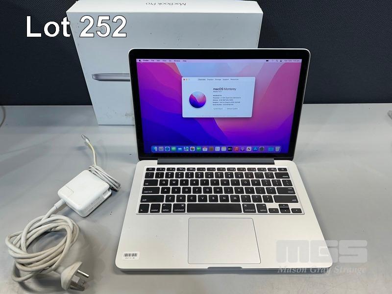 LAPTOP, APPLE MACBOOK PRO (A1502), CORE i5 5257U (5TH GEN) @ 2.7GHz, 8GB DDR3 RAM, 256GB SSD, 13.3" RETINA DISPLAY (2560x1600), INTEL IRIS GRAPHICS 6100, Wi-Fi, BLUETOOTH, MAC OS 12 INSTALLED & POWER SUPPLY S/N:C02S3DFQFVH5
