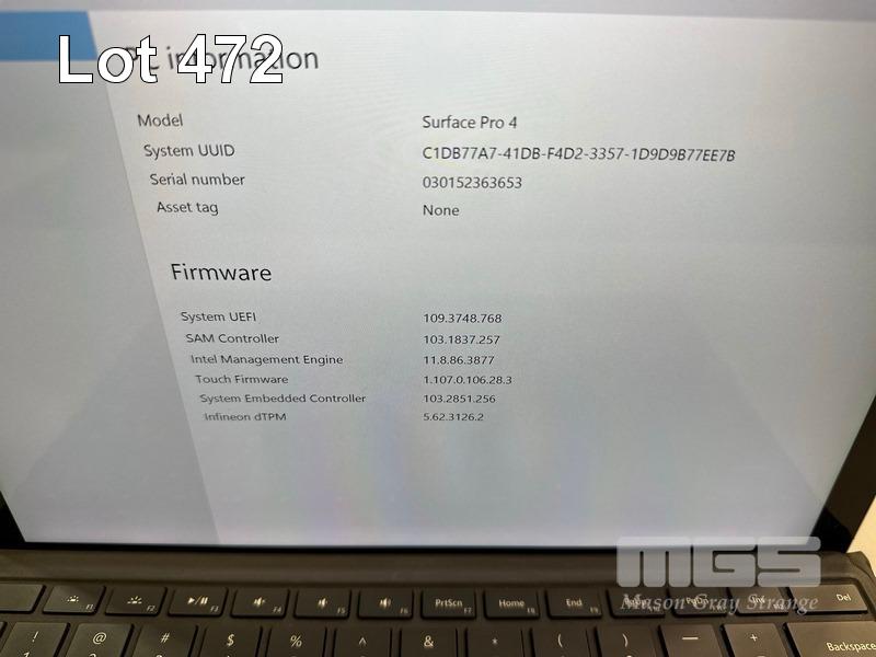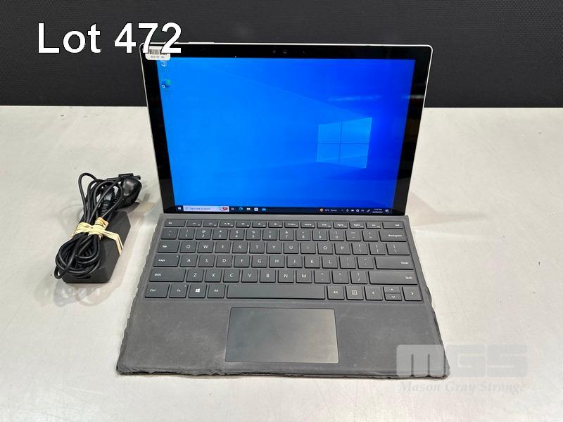 TABLET PC, MICROSOFT SURFACE PRO 4, MODEL 1724, CORE i5 6300U (6TH GEN) @ 2.4GHz, 8GB RAM, 256GB SSD, 12.3" TOUCHSCREEN (2736x1824), INTEL HD GRAPHICS 520, Wi-Fi, BLUETOOTH, WINDOWS 10 PRO INSTALLED, KEYBOARD TYPE COVER & POWER SUPPLY (NOTE: KEYBOARD COVER WORN) S/N:030152363653