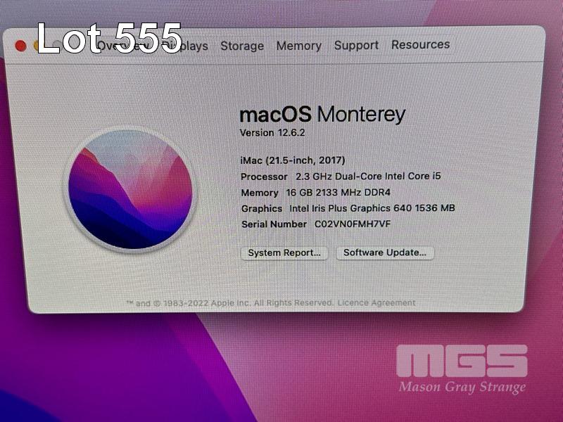APPLE iMAC (A1418), CORE i5 7360U (7TH GEN) @ 2.3GHz, 16GB DDR4 RAM, 256GB SSD, BUILT-IN 21.5" DISPLAY (1920x1080), INTEL IRIS PLUS GRAPHICS 640, Wi-Fi, BLUETOOTH, MAC OS 12 INSTALLED (NO KEYBOARD, NO MOUSE) S/N:C02VN0FMH7VF