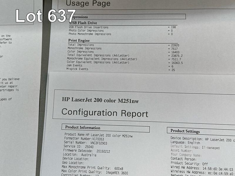 PRINTER, HP LASERJET PRO 200 COLOUR M251nw, USB, NETWORK, WIRELESS, 16,403 COLOUR & 7,517 B&W PAGES (TEST PAGE ATTACHED) S/N:VNC3F02903