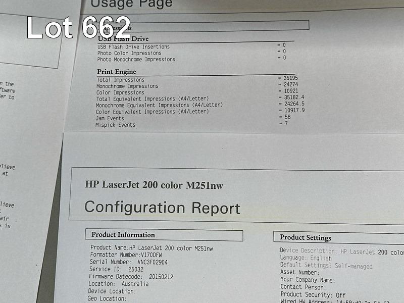 PRINTER, HP LASERJET PRO 200 COLOUR M251nw, USB, NETWORK, WIRELESS, 10,921 COLOUR & 24,274 B&W PAGES (TEST PAGE ATTACHED) S/N:VNC3F02904