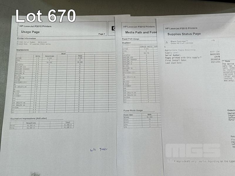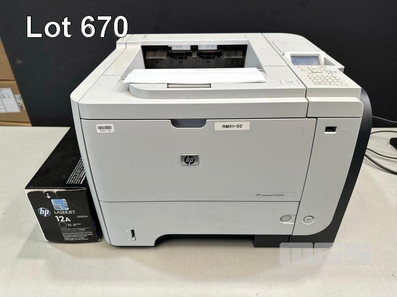 PRINTER, HP LASERJET P3015, USB, NETWORK, 61,603 PAGES (TEST PAGE ATTACHED - TONER VERY LOW) WITH SPARE TONER CARTRIDGE S/N:VNC3511143