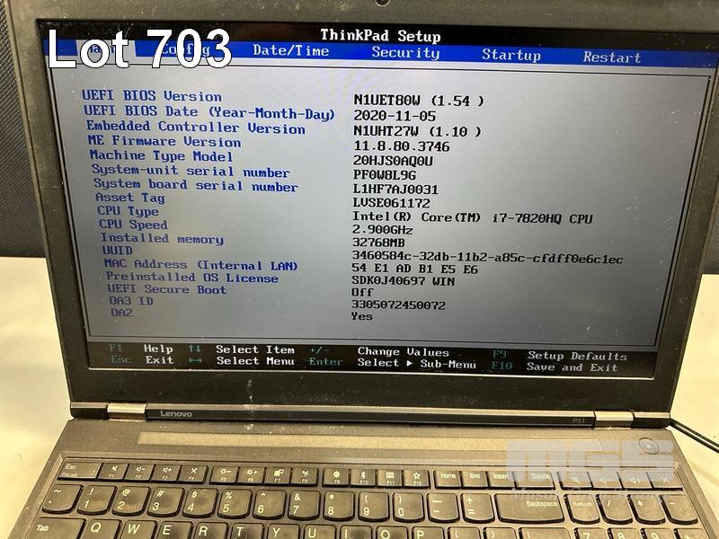 LAPTOP, LENOVO THINKPAD P51 MOBILE WORKSTATION, TYPE 20HJ, CORE i7 7820HQ (7TH GEN) @ 2.9GHz, 32GB DDR4 RAM, 512GB NVMe M.2 SSD, 15.6" WIDESCREEN (1920x1080), 4GB NVIDIA QUADRO M2200 VIDEO, Wi-Fi, BLUETOOTH, WINDOWS 10 PRO INSTALLED (NO POWER SUPPLY) (NOTE: CASING POOR CONDITION & DAMAGE, MARKS ON SCREEN, KEYBOARD FAULT, BATTERY NOT CHARGING) S/N:PF0W8L9G