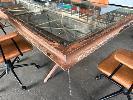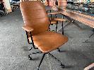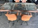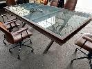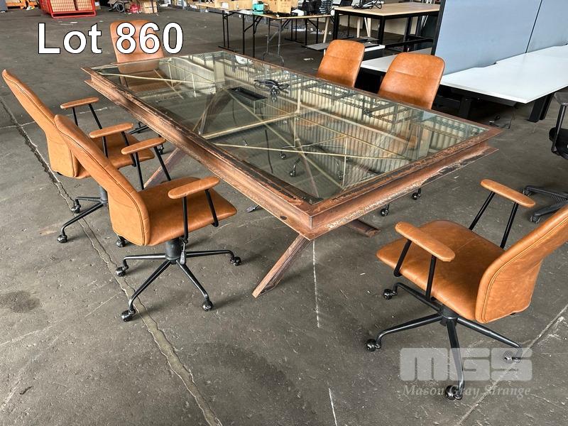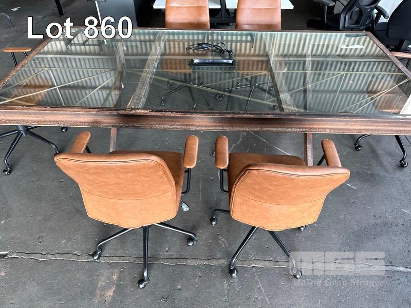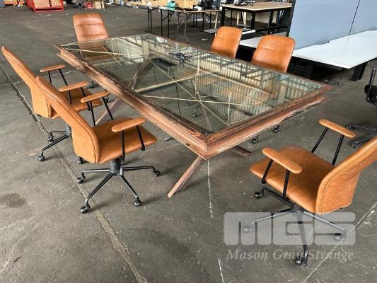 BOARDROOM TABLE, HEAVY DUTY RUSTIC STEEL FRAME, GLASS TOP WITH POWER INSERT, 250 x 120cm WITH 6 x FREEDOM OREN OFFICE CHAIRS, TAN LEATHER LOOK (NOTE: SOME ARMS WORN)