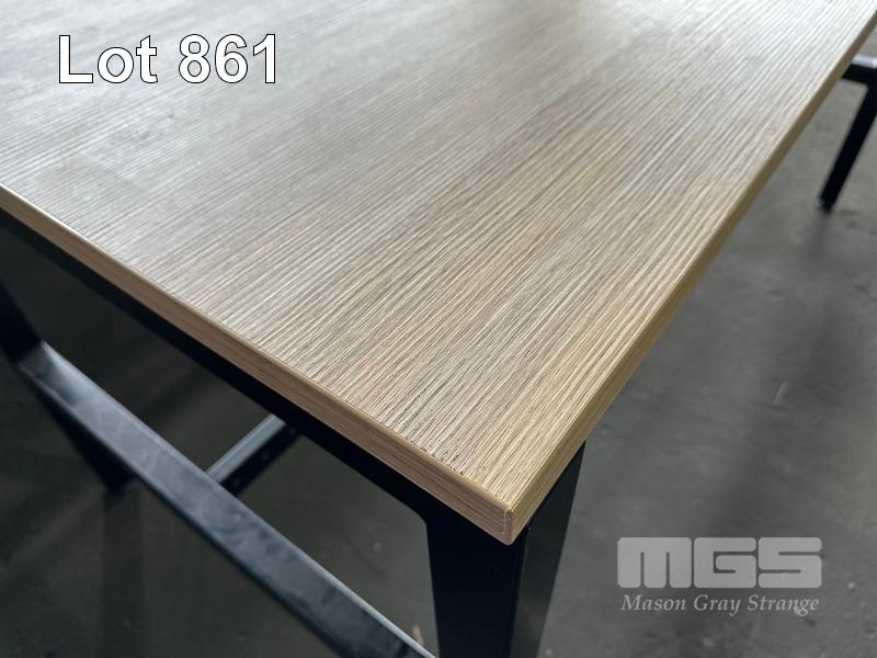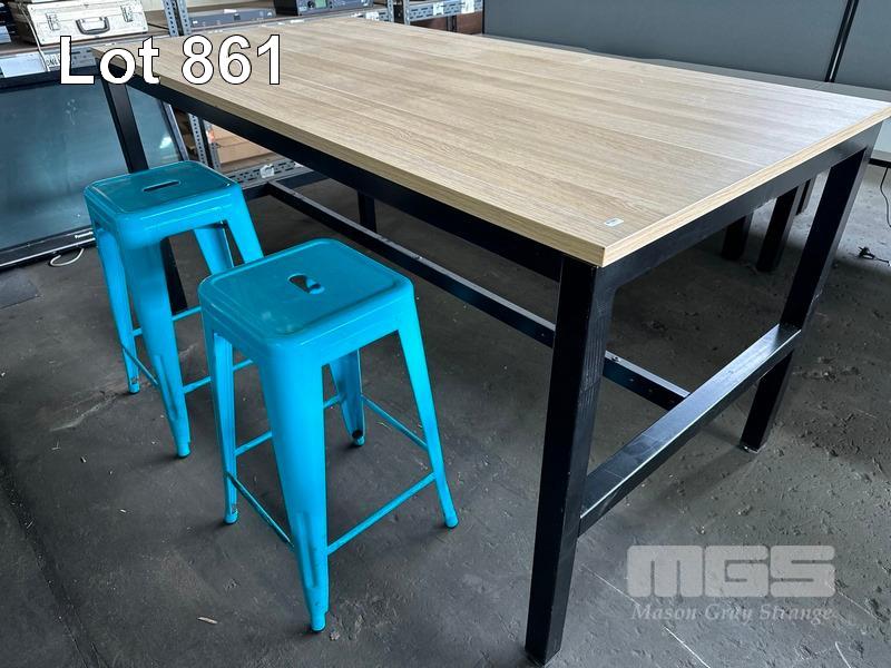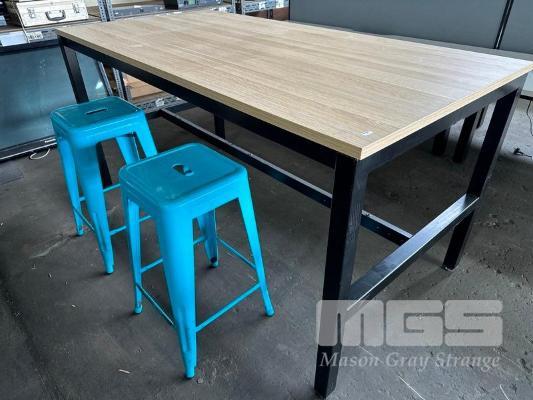 DRAFTING TABLE, NATURAL OAK LAMINATE TOP, BLACK STEEL FRAME, 180 x 90 x 90cm (H) WITH 2 x BAR STOOLS