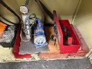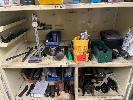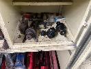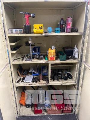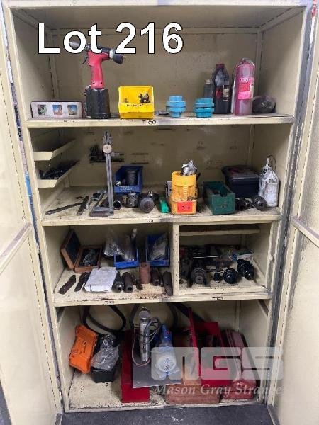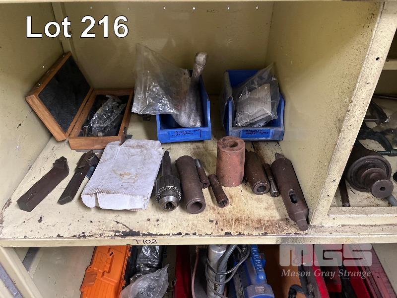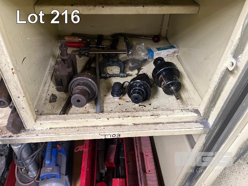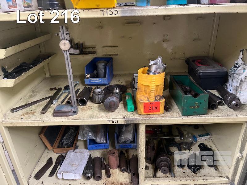 HEAVY DUTY STEEL WORKSHOP CUPBOARD & CONTENTS, LATHE TOOLS, DRILL CHUCKS, COUPLERS, HEIGHT GAUGE, DRILLS & SLEEVES & MICROMETER