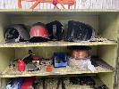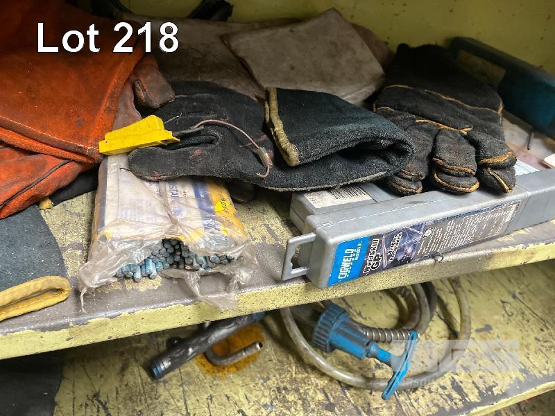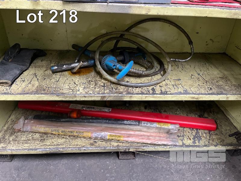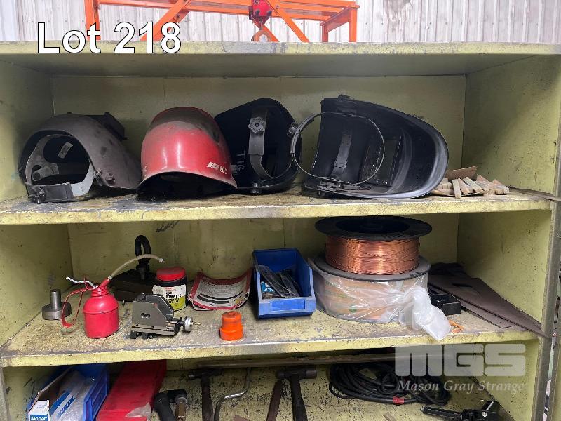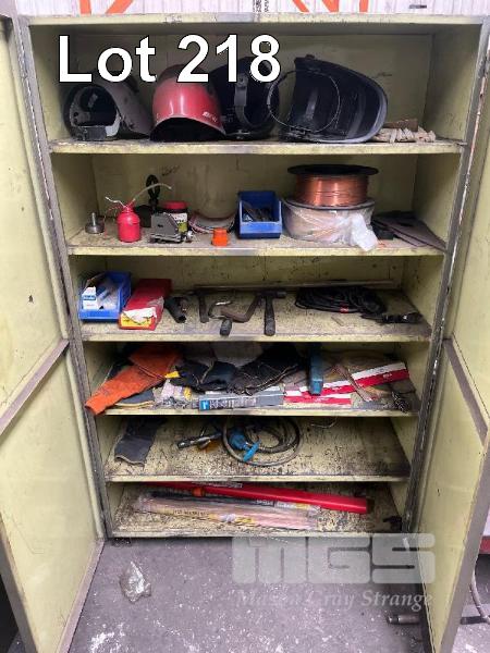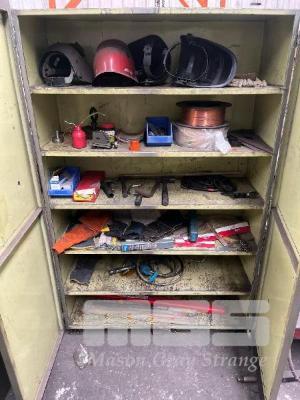 STEEL, HEAVY DUTY WORKSHOP CUPBOARD & CONTENTS, WELDING MASKS, MIG WIRE, WELDING GLOVES, WELDING WIRE, SET SQUARES, OIL PUMP & OIL CAN