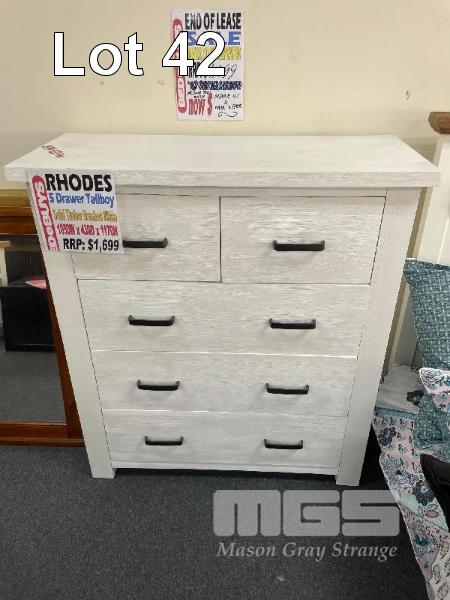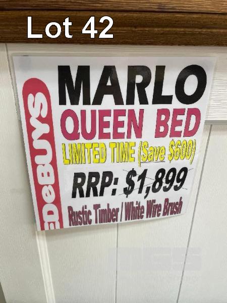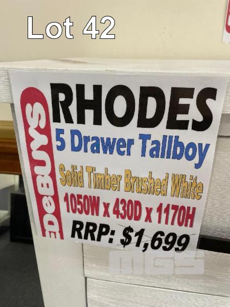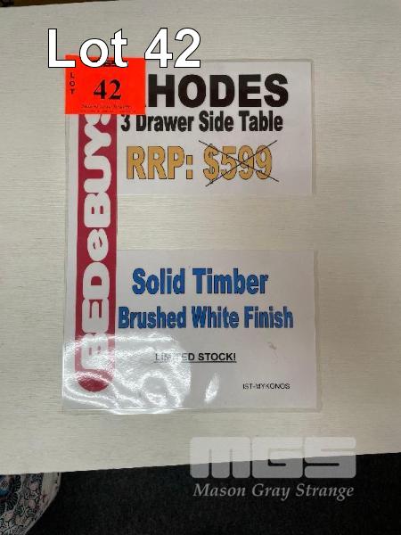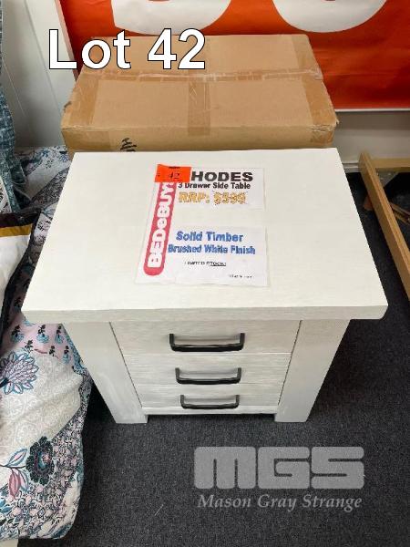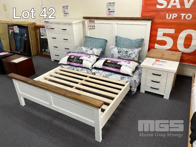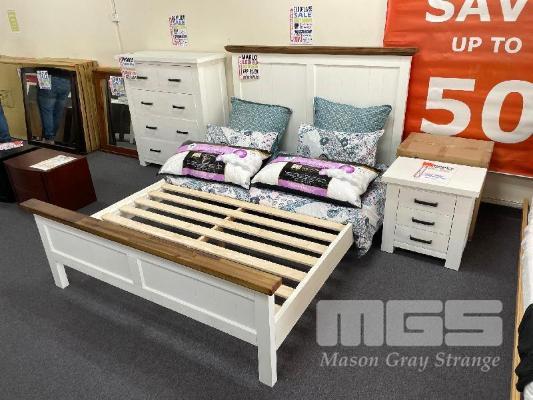 MARCO TIMBER QUEEN BED, WHITE TIMBER FINISH, 2 x RHODES BED SIDE TABLES & RHODES TALLBOY