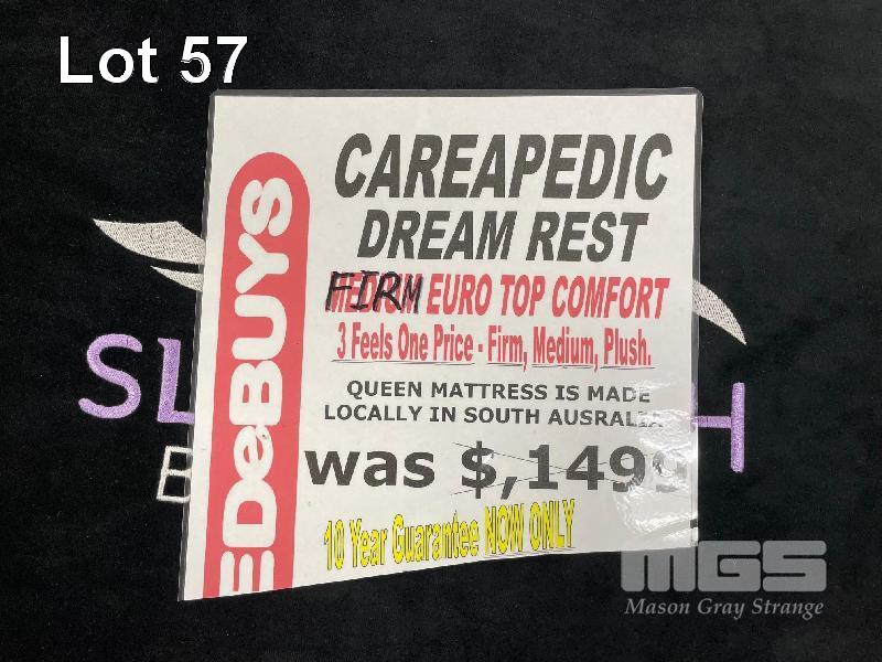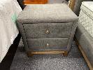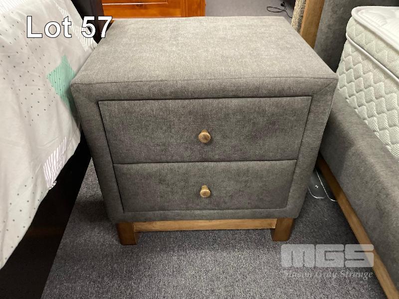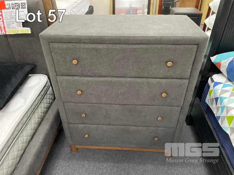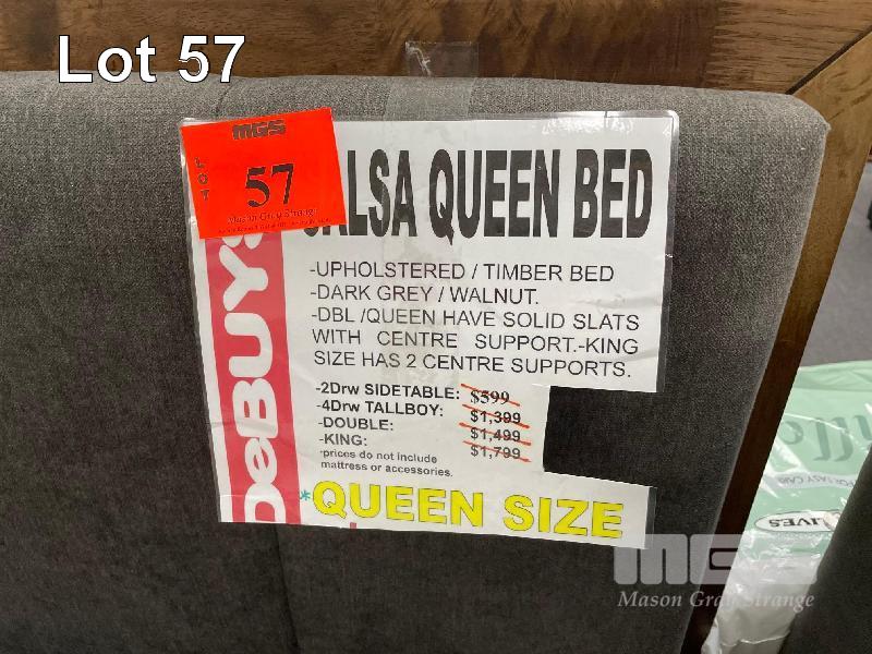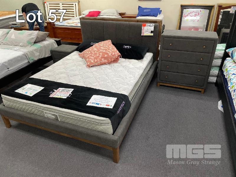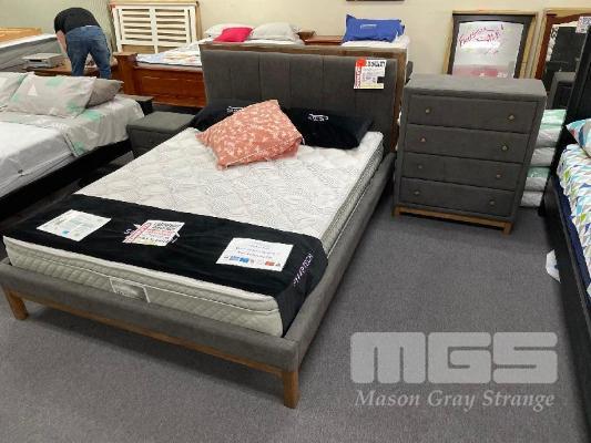 SALSA QUEEN BED, WITH 4 DRAWER TALLBOY, MATCHING SIDE TABLE, 2 DRAWER, GREY FABRIC & CAREA PEDIC DREAM REST MATTRESS