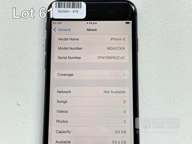 APPLE iPHONE 8, 64GB, SPACE GREY, MODEL MQ6K2X/A, BATTERY HEALTH 92% (NO CABLE, NO CHARGER) (NOTE: SCRATCHES ON SCREEN) S/N:FFNYDBFBJC6C