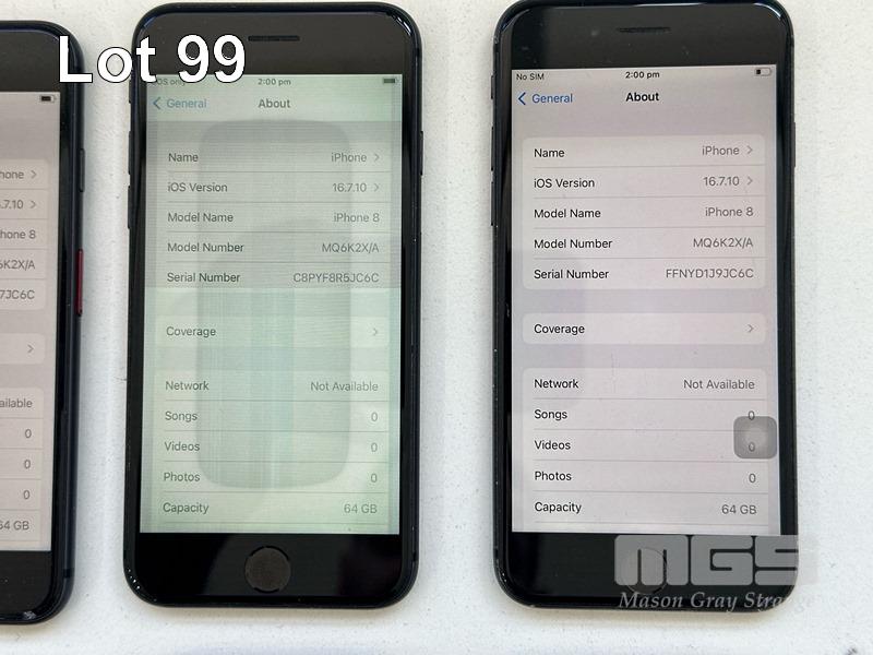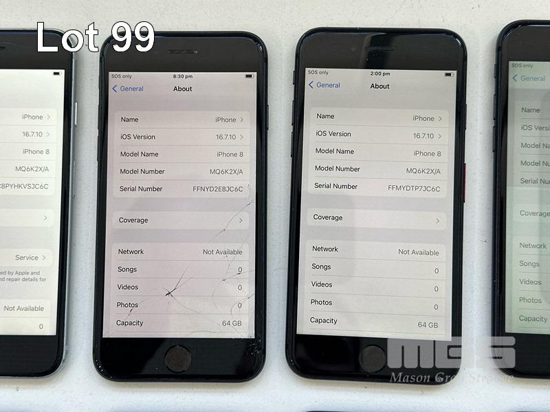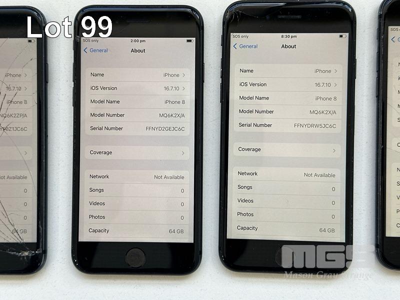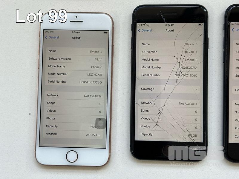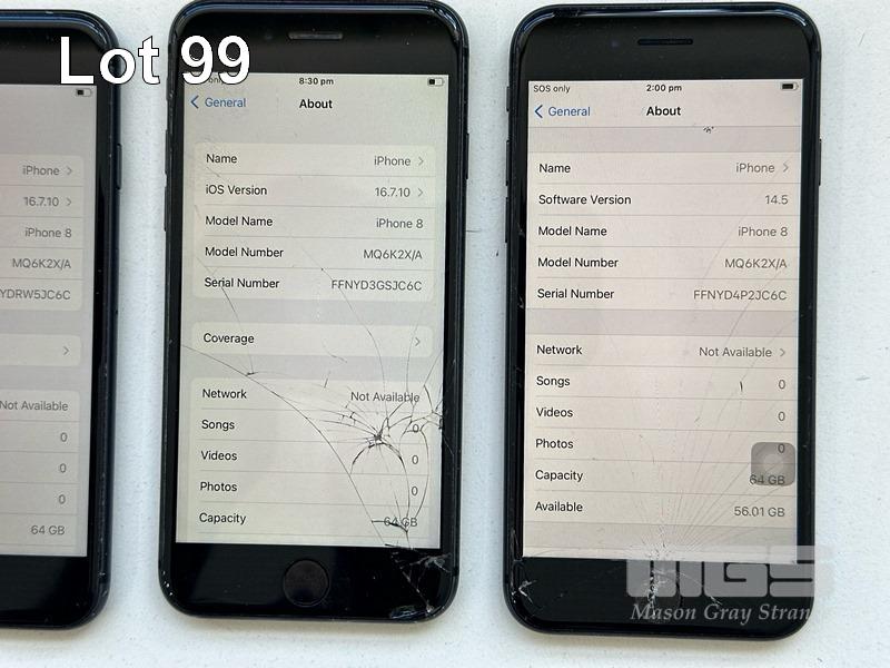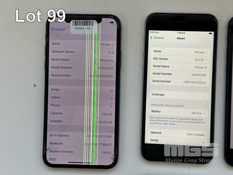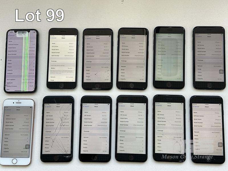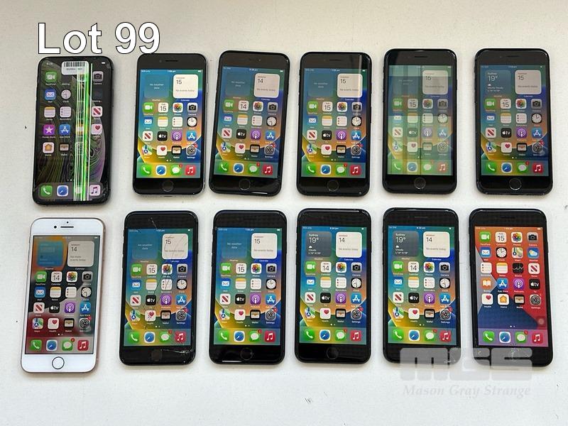 1 x APPLE iPHONE XS, 256GB, SPACE GREY, MT9H2X/A 1 x APPLE iPHONE 8, 256GB, GOLD, MODEL MQ7H2X/A 10 x APPLE iPHONE 8, 64GB, SPACE GREY, MODEL MQ6K2X/A (NO CABLES, NO CHARGERS) (NOTE: ALL VARIOUS DAMAGE, 3 x FAULTY HOME BUTTONS, 2 x FAULTY SCREENS) S/N:DNQXGB9JKPG4, C8PYHKVSJC6C, C8PYHKVSJC6C, FFNYD2E8JC6C, FFMYDTP7JC6C, C8PYF8R5JC6C, FFNYD1J9JC6C, C6KVFB3TJC6Q, GGLYF0Z1JC6C, FFNYD2GEJC6C, FFNYDRW5JC6C, FFNYD3GSJC6C, FFNYD4P2JC6C
