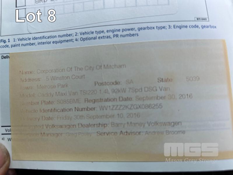 2016 VOLKSWAGEN CADDY VAN REG: S085 BME (SA) VIN: WV1ZZZZKZGXD86255 ODO: 259,876kms SHOWING 4 CYLINDER PETROL, AUTOMATIC TRANSMISSION, 5 DOORS, 2 SEAT, AIR BAG, AIR CON, BLUETOOTH, CENTRAL LOCKING, CRUISE CONTROL, POWER WINDOWS, SPARE WHEEL, BARN DOORS ON REAR, ROOF VENT KEY #6 (WITH 1 KEY/S) CONDITION: LEFT SIDE - DAMAGE LEFT HEADLIGHT - BROKEN CONDITION - POOR