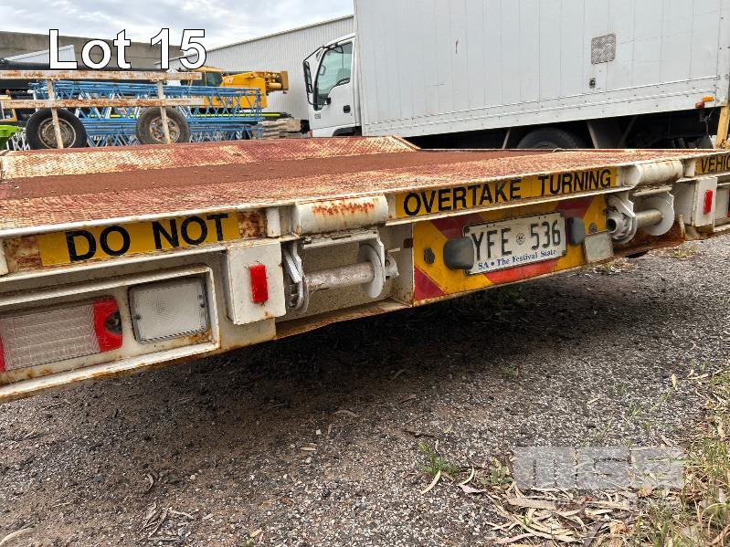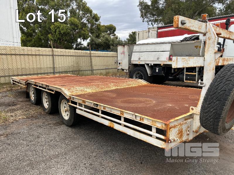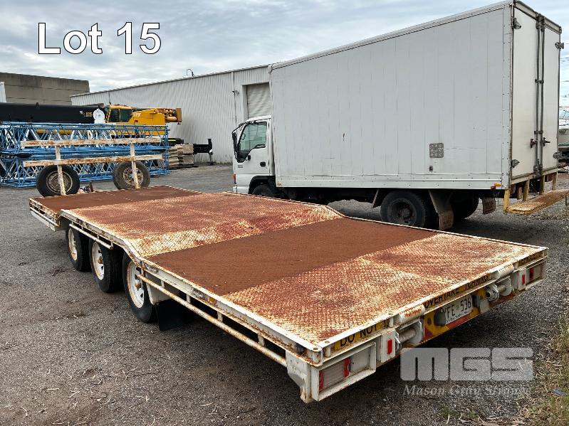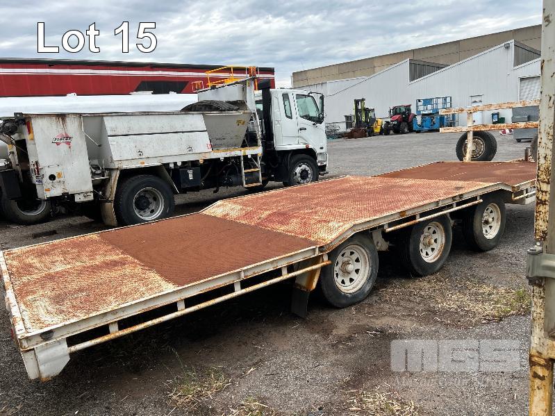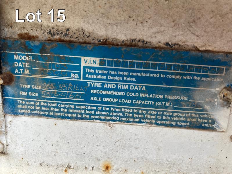 2003 TEAM POLY 15.4' FLAT TOP TRAILER TRIAXLE (4.7 x 2.5m) MODEL: PT3L REG: YFE 536 VIN / CHASSIS: 6T9T2400S321HT004 SPRING SUSPENSION, 205/85R16, AIR BRAKES/DRUM, RING FEEDER, UL: 2,420kg GTM: 7,700kg ATM: 8,500kg 2 x SPARE WHEELS, FRONT GATE