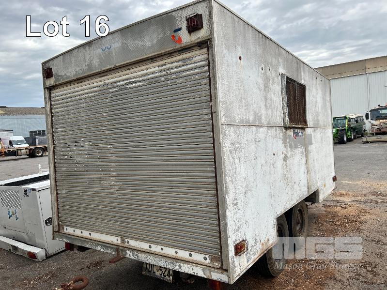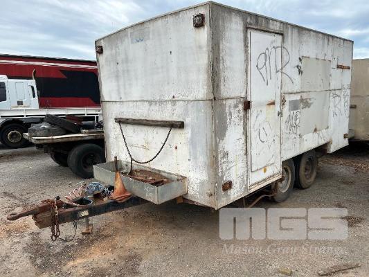1992 BRIMARCO IND. ENCLOSED TRAILER/CARAVAN, TANDEM AXLE, MOBILE WORKSHOP/STORAGE REG: TDC 524 (SA) VIN: 6B9BM192NBAB7163 SIZE : 4410 x 2410 x 2670mm (H) FULLY ENCLOSED ALLOY CLAD BODY WITH REAR ROLLER DOOR, 1 x WINDOW & ROOF MOUNT POP UP VENT, BUILT IN SHELVING & RACKING, WORK BENCH & SEATING RING FEEDER HITCH, AIR BRAKES TYRE SIZE: 7.50R16LT GVM: 4,490kg