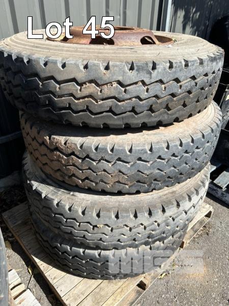 4 x TRUCK RIMS & TYRES, 10 STUD, SM203-10.00 R20 50% TREAD