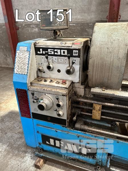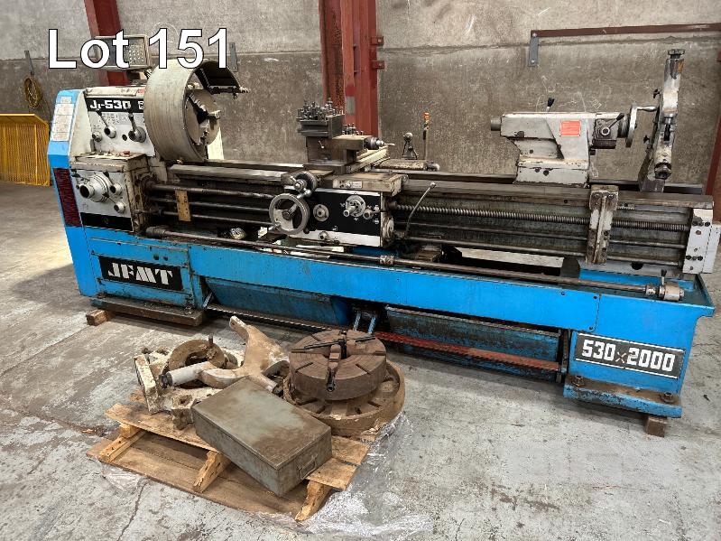 LATHE, JFMT MOD: J-530 X 2000 GAPPED BED LENGTH: 2600mm SWING: 530mm FEED THROUGH: 80mm DIAMETER FITTED WITH SINO DRO, MOD: SDS2L TOOL HOLDERS 3 x 4 JAW CHUCKS, 3 x STEADIES, 2 x SWARF TRAY TOLLIES, FACE PLATE, ETC, 415V WEIGHT: 2870kg