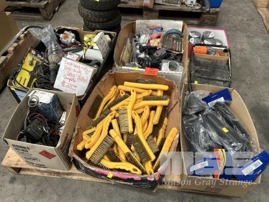 ASSORTED HAND TOOLS & HARDWARE INCLUDING BRASS WIRE BRUSHES, MULTI METERS & ELEC TESTERS, TAP & DIE SET, PUMP, ELEC TAPE, ROD HOLDERS, SACK TRUCK TYRES, ETC 1 x PALLET