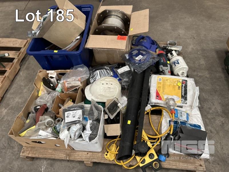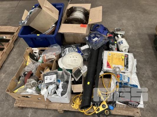 ASSORTED HARDWARE, TOOLS & ELECTRONICS INC XU1 BLOWER VAC, BOSCH GWS 24 ANGLE GRINDER, FLEXIBLE STAINLESS STEEL PIPE JOINER, BANDSAW BLADES, FUSES, SWITCHES, ETC 1 x PALLET