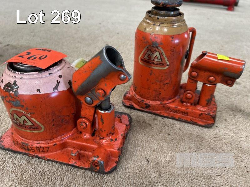 2 x HYDRAULIC BOTTLE JACKS, MASADA INC. HFD 10F3 , 2 STAGE, 10 TON & SINGLE STAGE 20T