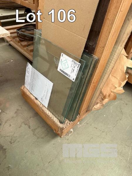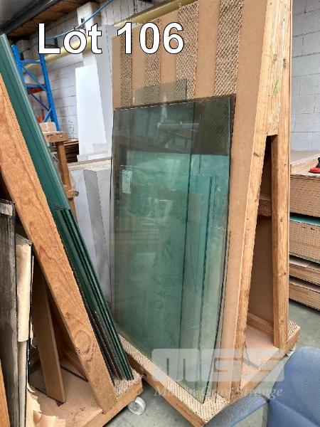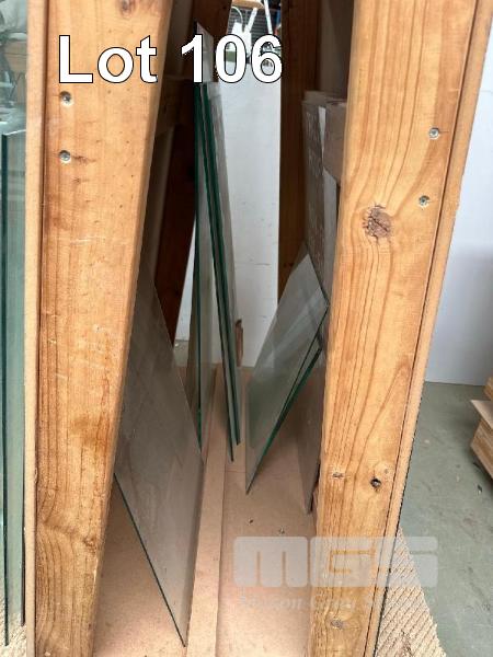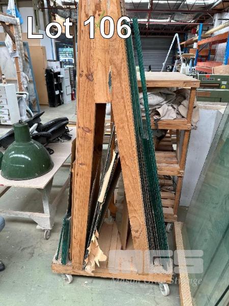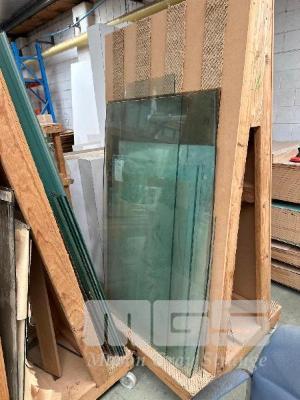 2 x TIMBER GLASS TROLLEYS WITH 37 x ASSORTED GLASS PIECES, UP TO 13mm THICK