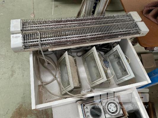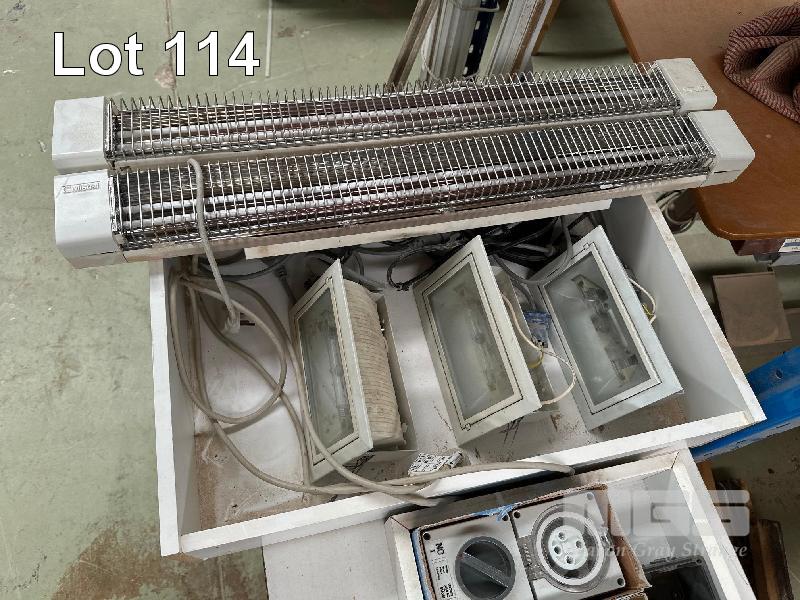 3 x FLOOD LIGHTS, 2 x MISTRAL HEAT LAMPS, ASSORTED ELECTRICAL SWITCHES & 415V PLUGS