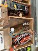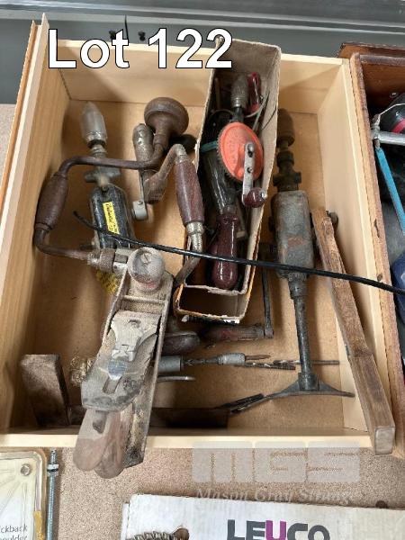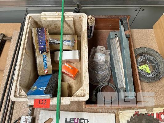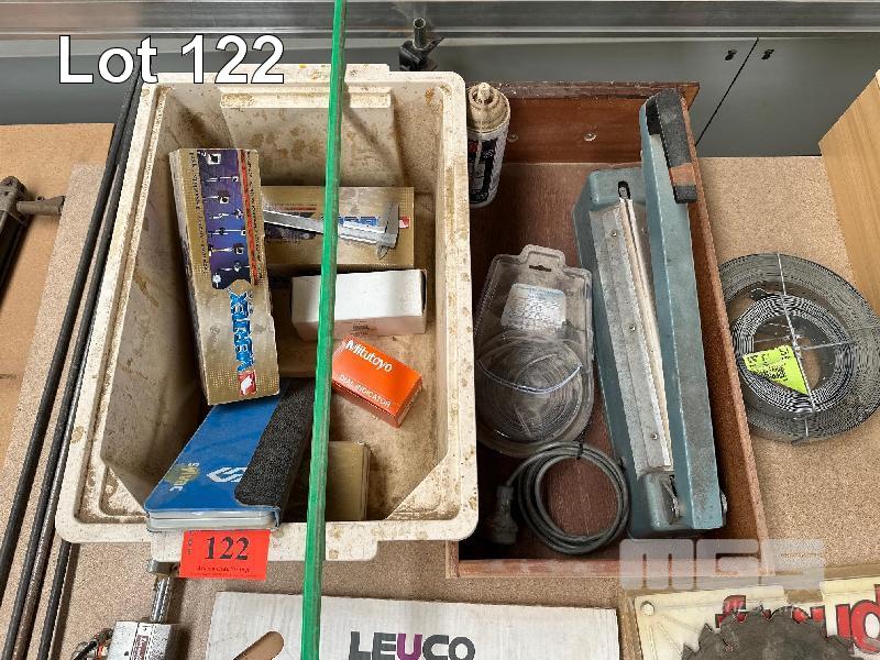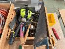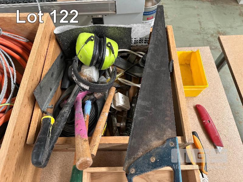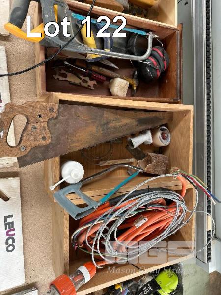 ASSORTED TOOLS & HARDWARE INCLUDING VERNIERS, DIAL INDICATORS, HAND SAWS, VINTAGE DRILLS, GALV STRAPPING, HAMMERS, 415V POWER CABLE, ETC