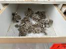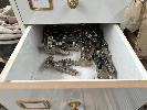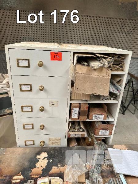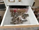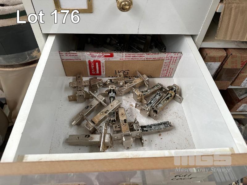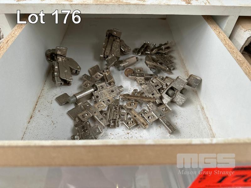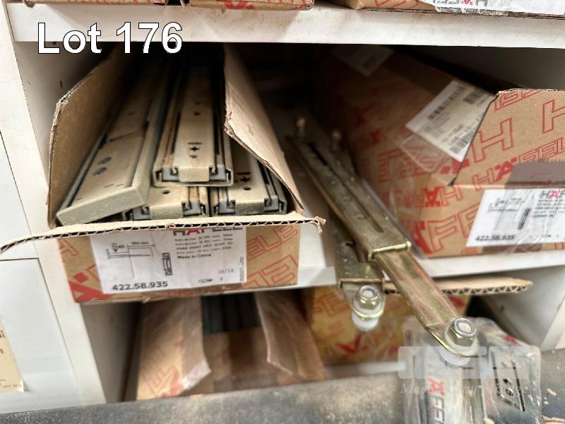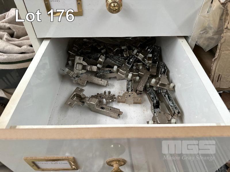 LARGE QUANTITY DRAWER SLIDES, HINGES, SOFT CLOSE, CLIP STAYS, INCLUDES STORAGE UNIT ON ROLLERS & MOBILE BENCH