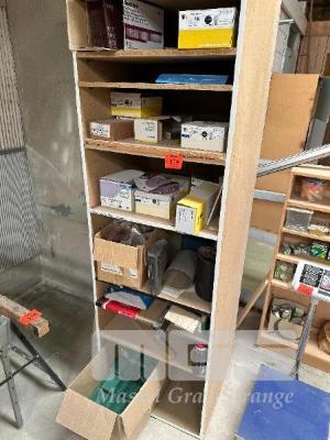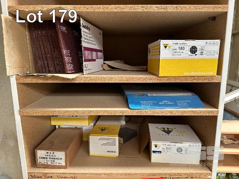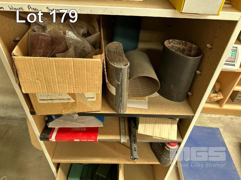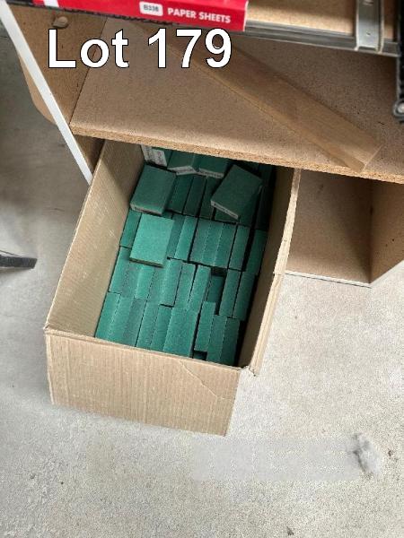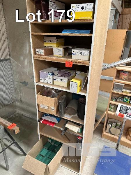 LARGE QUANTITY ASSORTED SANDING DISCS, BLOCKS, SCOTCH PAD & SHELF UNIT