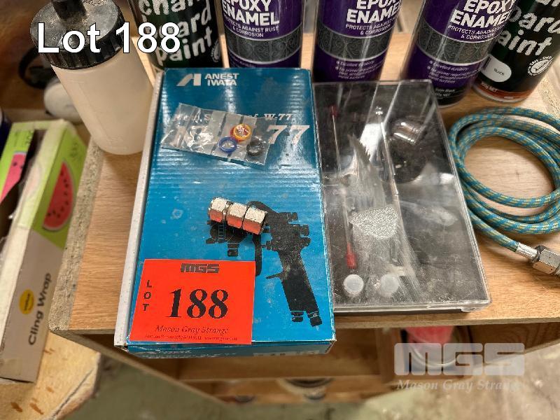 ANEST AIR BRUSH, GUN PARTS, SPRAY PAINTS & SHELF UNIT