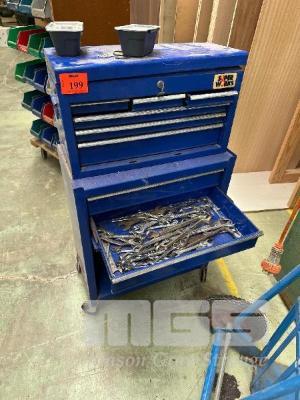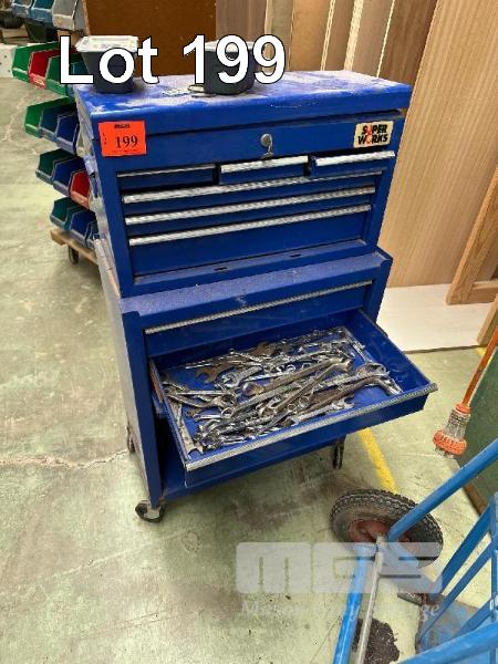 TOOLBOX, SUPERWORKS ON MOBILE STAND INCLUDES SPANNERS & DRILL BITS