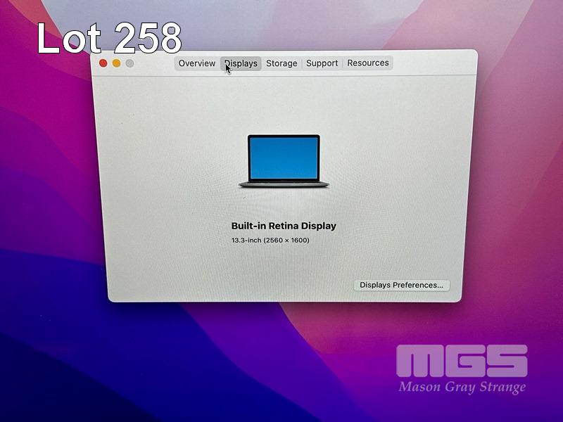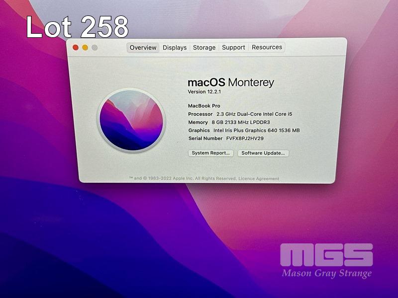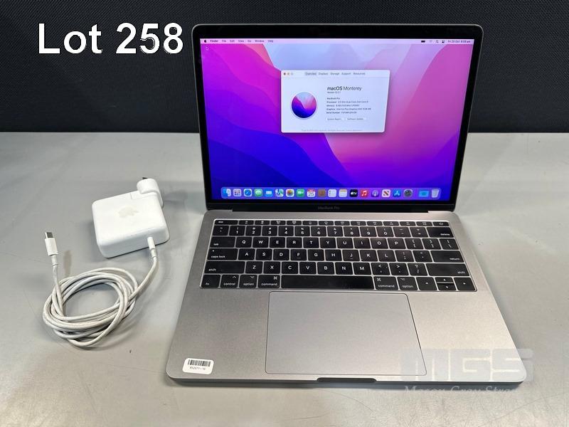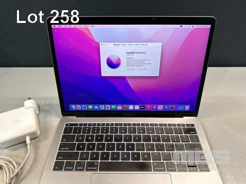 LAPTOP, APPLE MACBOOK PRO (A1708), CORE i5 7360U (7TH GEN) @ 2.3GHz, 8GB DDR3 RAM, 256GB SSD, 13.3" RETINA DISPLAY (2560x1600), INTEL IRIS PLUS GRAPHICS 640, Wi-Fi, BLUETOOTH, MAC OS 12 INSTALLED & USB-C POWER SUPPLY (NOTE: MINOR MARKS ON SCREEN) S/N:FVFX8PJ2HV29