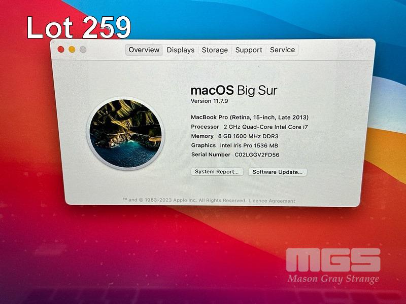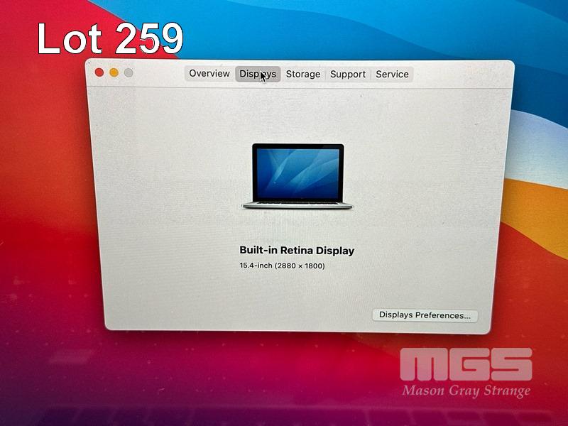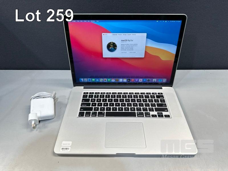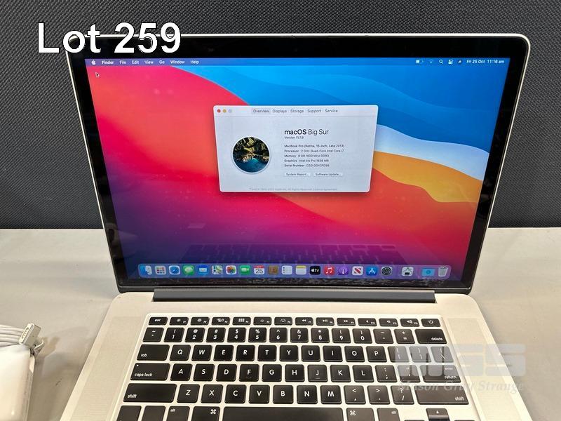 LAPTOP, APPLE MACBOOK PRO (A1398), CORE i7 4870HQ (4TH GEN) @ 2GHz, 8GB DDR3 RAM, 256GB SSD, 15.4" RETINA DISPLAY (2880x1800), INTEL IRIS PRO GRAPHICS, Wi-Fi, BLUETOOTH, MAC OS 11.7 INSTALLED & POWER SUPPLY (NOTE: MARKS ON SCREEN, MINOR DENT TO CASING) S/N:C02LGGV2FD56