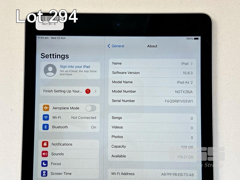 APPLE iPAD AIR 2, 128GB, Wi-Fi, SPACE GREY, MODEL NGTX2B/A, A1566 (NO CABLE, NO CHARGER) S/N:F6QSR01VG5W1