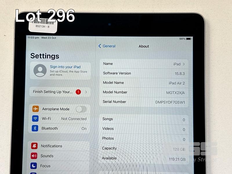 APPLE iPAD AIR 2, 128GB, Wi-Fi, SPACE GREY, MODEL MGTX2X/A, A1566 (NO CABLE, NO CHARGER) S/N:DMPSYDF7G5W1