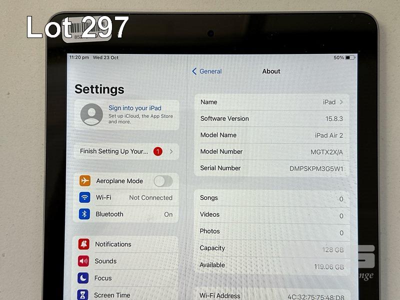 APPLE iPAD AIR 2, 128GB, Wi-Fi, SPACE GREY, MODEL MGTX2X/A, A1566 (NO CABLE, NO CHARGER) S/N:DMPSKPM3G5W1