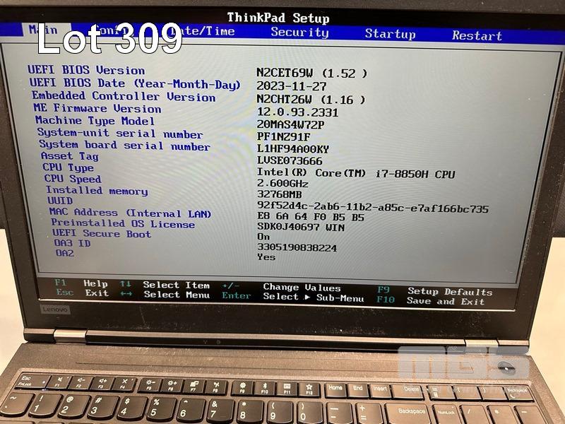 LAPTOP, LENOVO THINKPAD P52 MOBILE WORKSTATION, TYPE 20MA, CORE i7 8850H (8TH GEN) @ 2.6GHz, 32GB DDR4 RAM, 512GB NVMe M.2 SSD, 15.6" WIDESCREEN (1920x1080), 4GB NVIDIA QUADRO P2000 VIDEO, Wi-Fi, BLUETOOTH, WINDOWS 11 PRO INSTALLED (NO POWER SUPPLY) (NOTE: MARKS ON SCREEN) S/N:PF1NZ91F