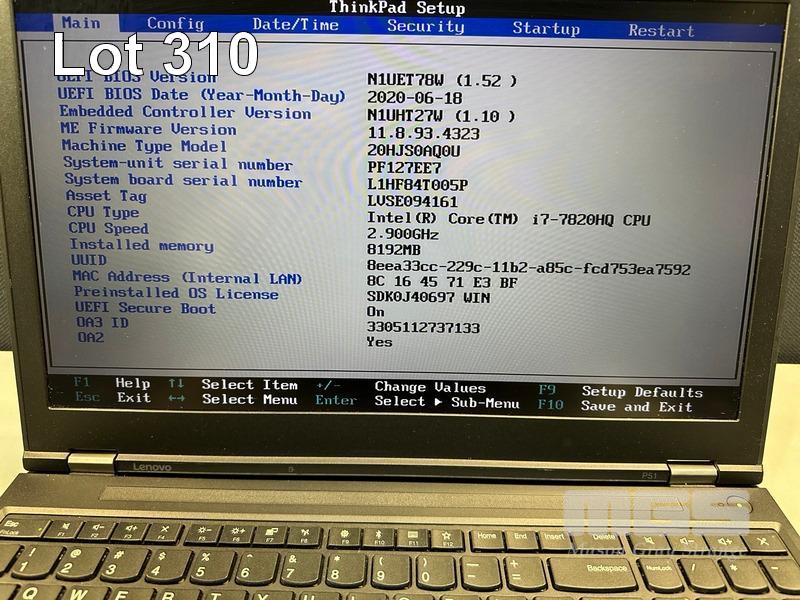 LAPTOP, LENOVO THINKPAD P51 MOBILE WORKSTATION, TYPE 20HJ, CORE i7 7820HQ (7TH GEN) @ 2.9GHz, 8GB DDR4 RAM, 512GB NVMe M.2 SSD, 15.6" WIDESCREEN (1920x1080), 4GB NVIDIA QUADRO M2200 VIDEO, Wi-Fi, BLUETOOTH, WINDOWS 10 PRO INSTALLED (NO POWER SUPPLY) (NOTE: MINOR MARKS ON SCREEN) S/N:PF127EE7