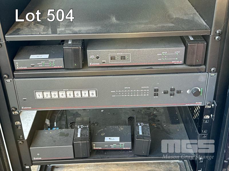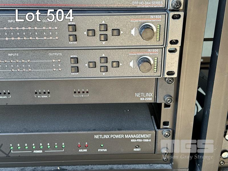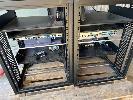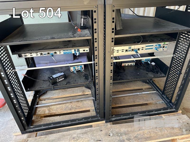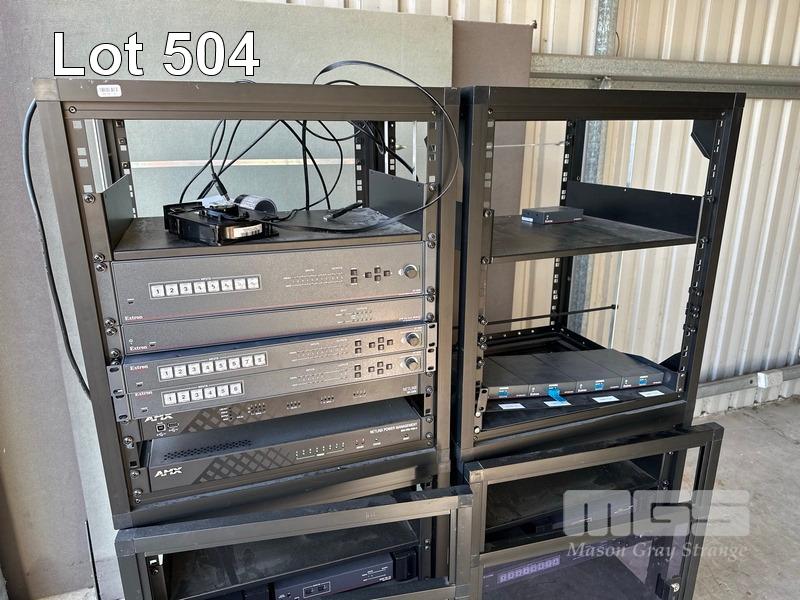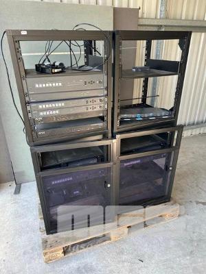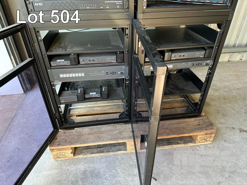 2 x DATA RACK FRAMES, 12RU 2 x DATA RACK FRAMES, 15RU WITH DOORS (NO KEYS) WITH CONTENTS INC. AMX & EXTRON EQUIPMENT, POWERBOARDS