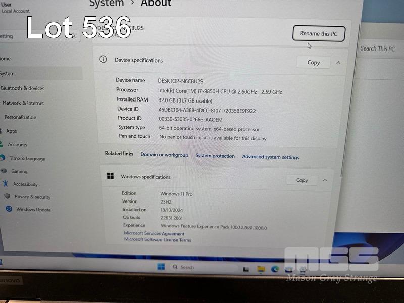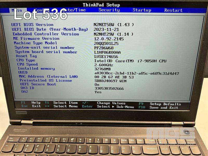 LAPTOP, LENOVO THINKPAD P53 MOBILE WORKSTATION, TYPE 20QQ, CORE i7 9850H (9TH GEN) @ 2.6GHz, 32GB DDR4 RAM, 512GB NVMe M.2 SSD, 15.6" WIDESCREEN (1920x1080), 4GB NVIDIA QUADRO T2000 VIDEO, Wi-Fi, BLUETOOTH, WINDOWS 11 PRO INSTALLED (NO POWER SUPPLY) (NOTE: DAMAGE TO CASING, MARKS ON SCREEN) S/N:PF2D6W68