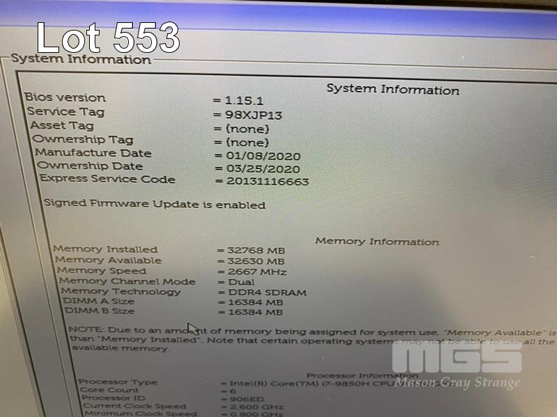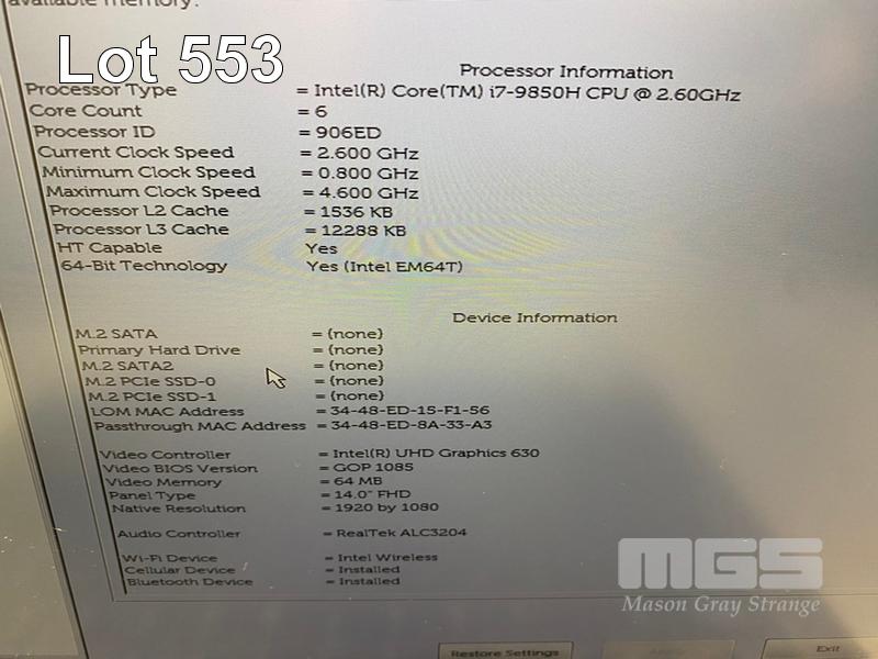 LAPTOP, DELL LATITUDE 5401, CORE i7 9850H (9TH GEN) @ 2.6GHz, 32GB DDR4 RAM, NO HDD, 14" WIDESCREEN (1920x1080) & POWER SUPPLY (NOTE: MARKS ON SCREEN) S/N:98XJP13
